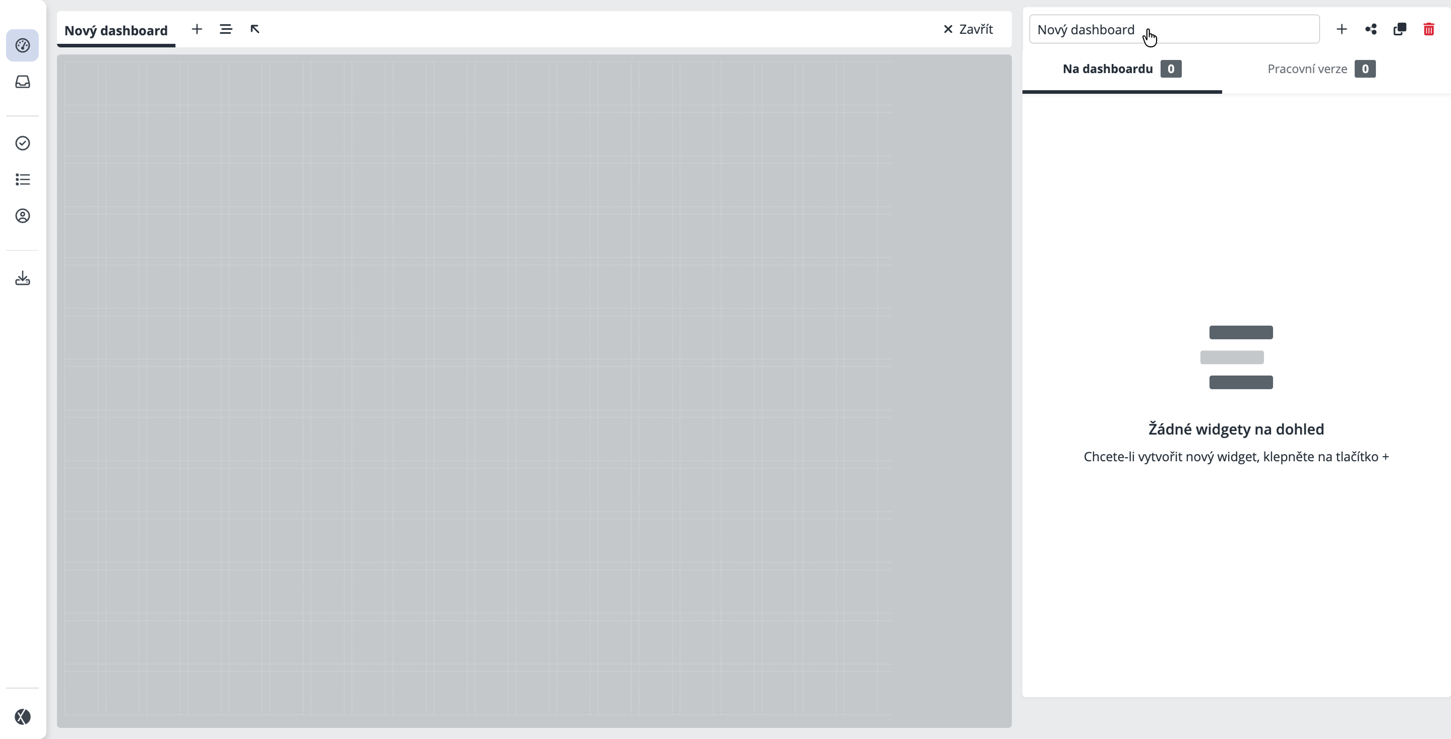 Pokud ještě nemáte žádný dashboard, zobrazí se prázdná plocha s tlačítkem + Vytvořit. Kliknutím na tlačítko se otevře nový prázdný dashboard a pracovní plocha se rozdělí na dvě hlavní části. Levá část slouží jako rozvržení vašeho dashboardu – zde budete umisťovat jednotlivé widgety. Pravá část obsahuje ovládací panel, kde spravujete obsah dashboardu a vybíráte widgety k použití.