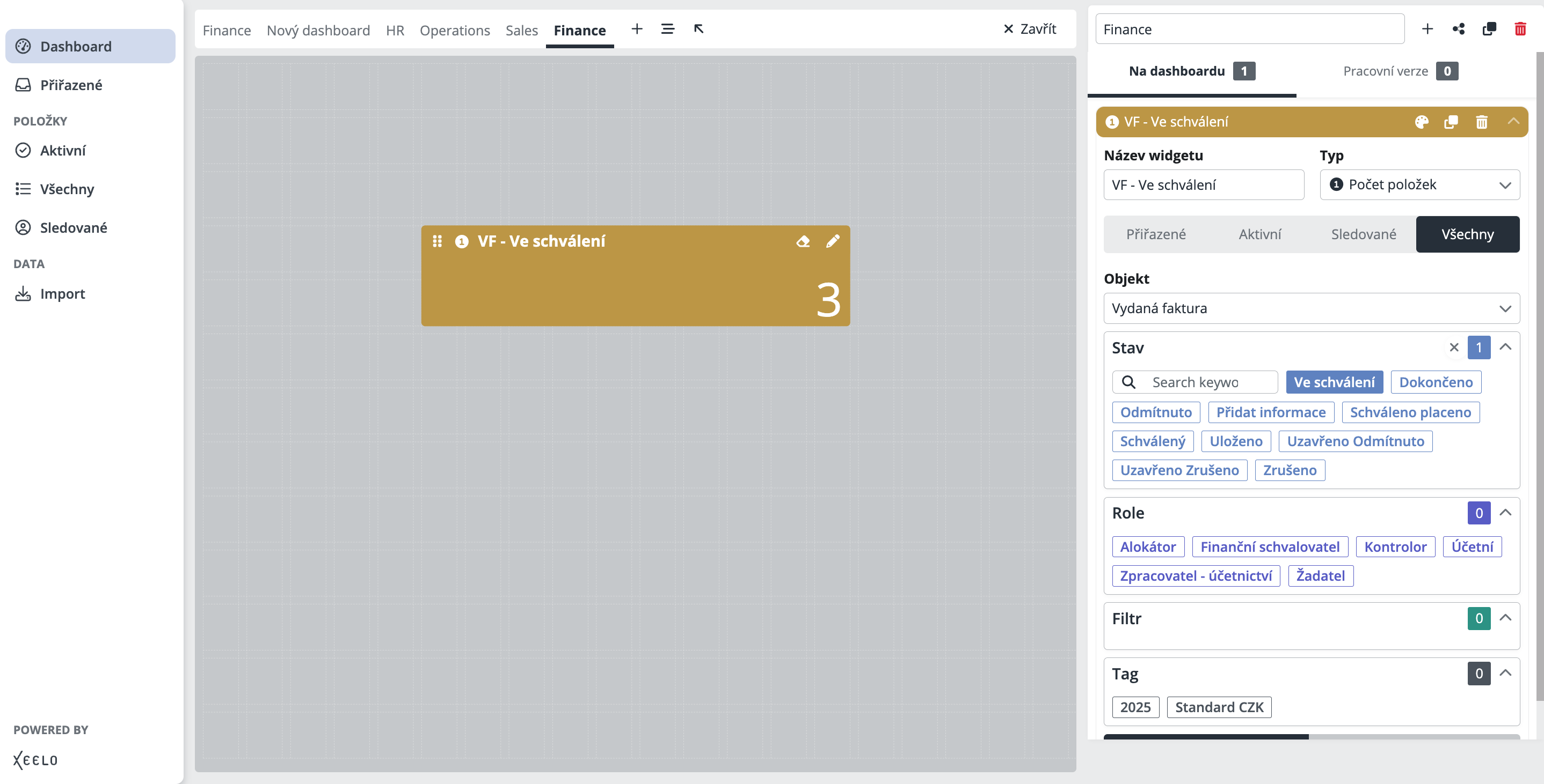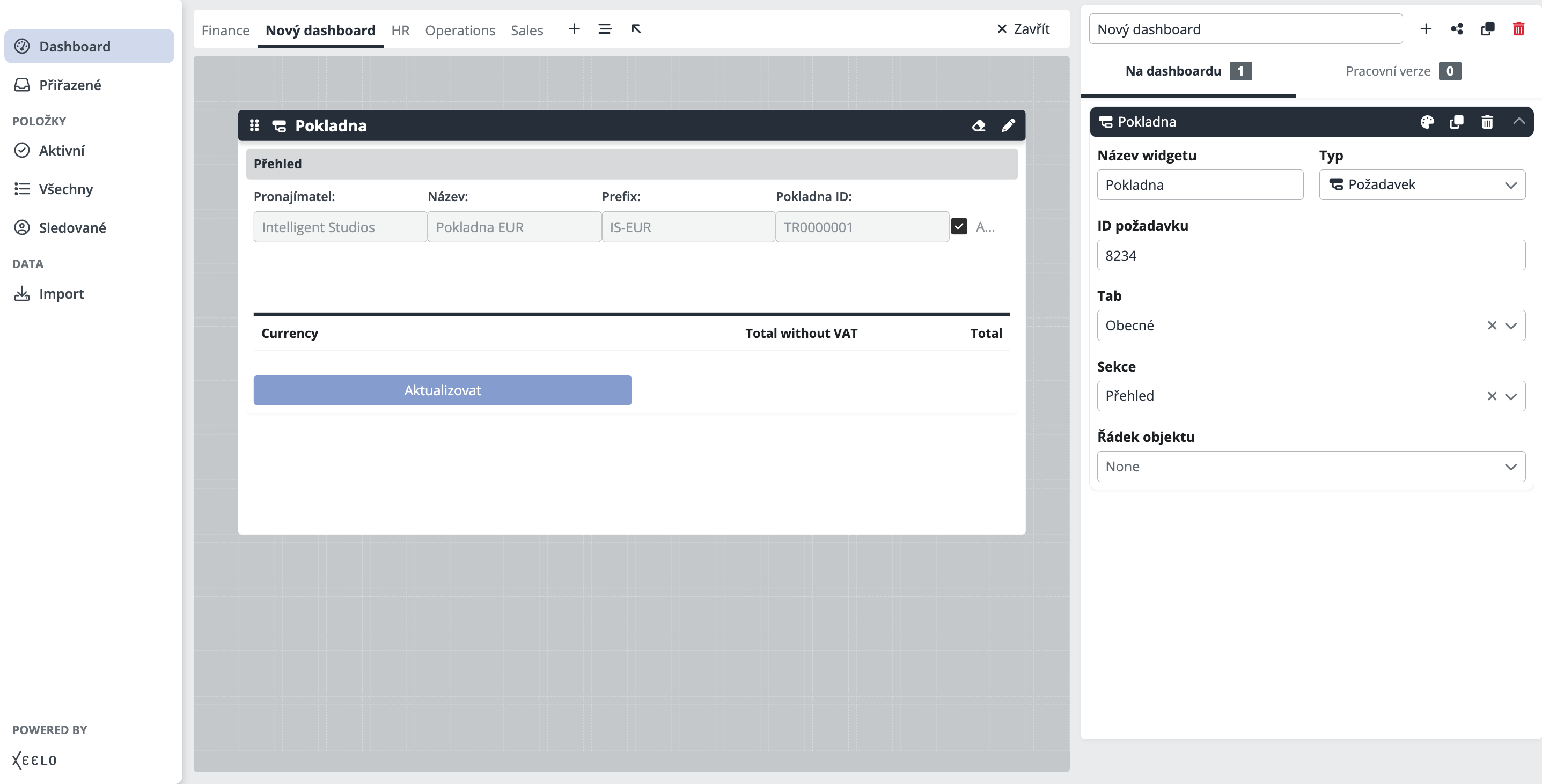 Na widgetu zároveň najdete další nástroje pro rychlou správu. Pomocí ikony se symbolem tužky lze otevřít postranní panel s nastavením a upravit widget bez nutnosti ho znovu přetahovat. Druhá ikona, se symbolem gumy, umožní widget z dashboardu odebrat – widget se přesune do sekce Pracovní verze, konfigurace přitom zůstane zachována a lze ji kdykoliv znovu použít.