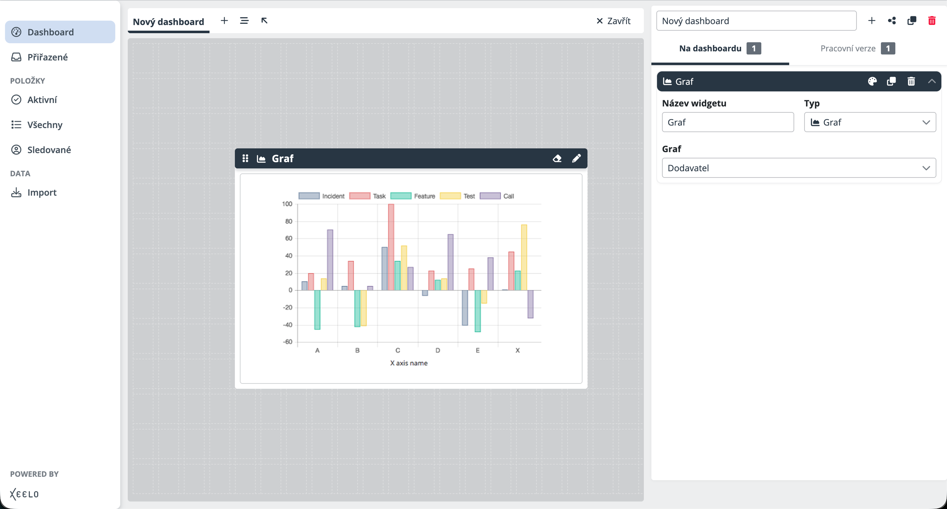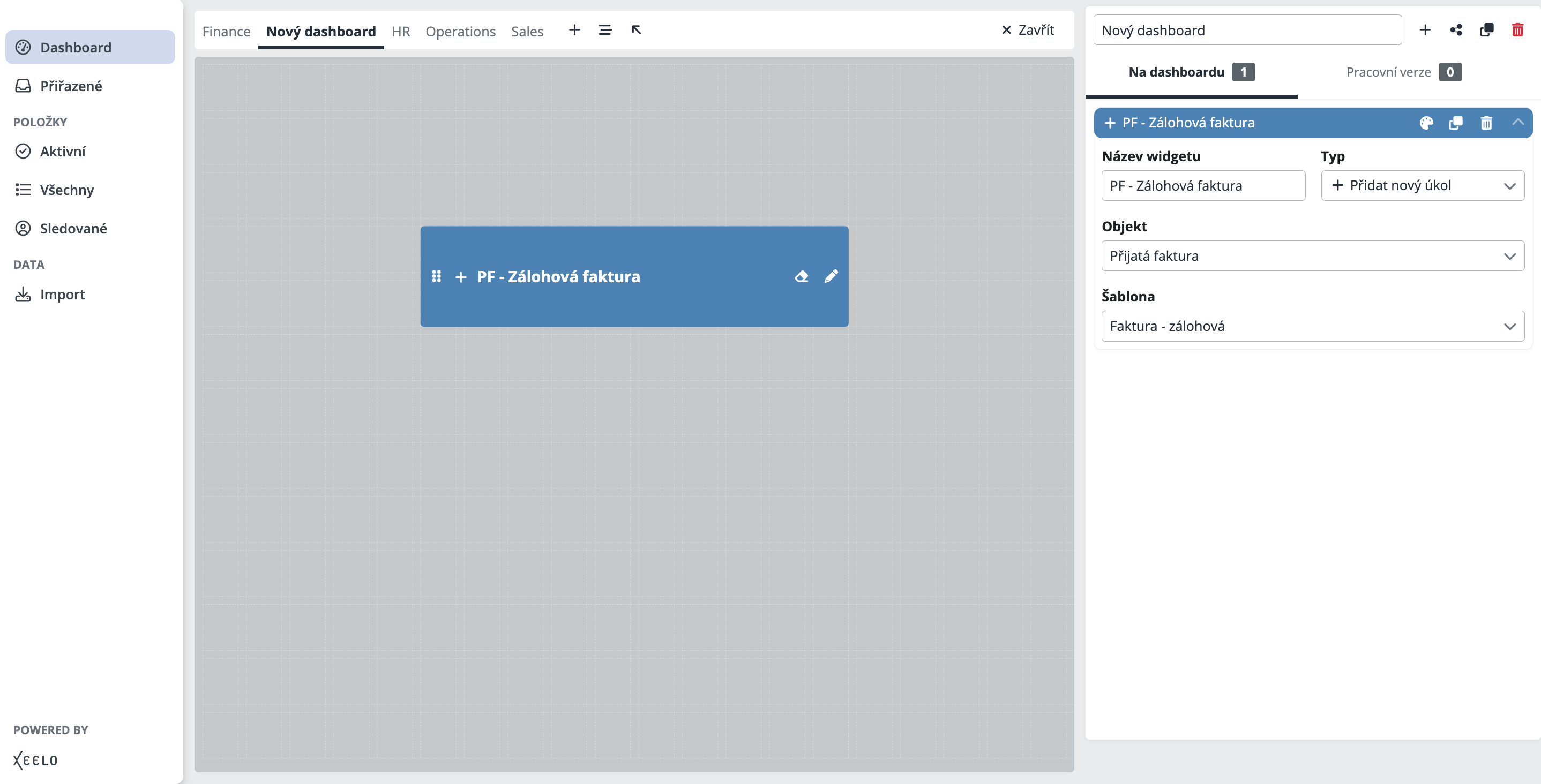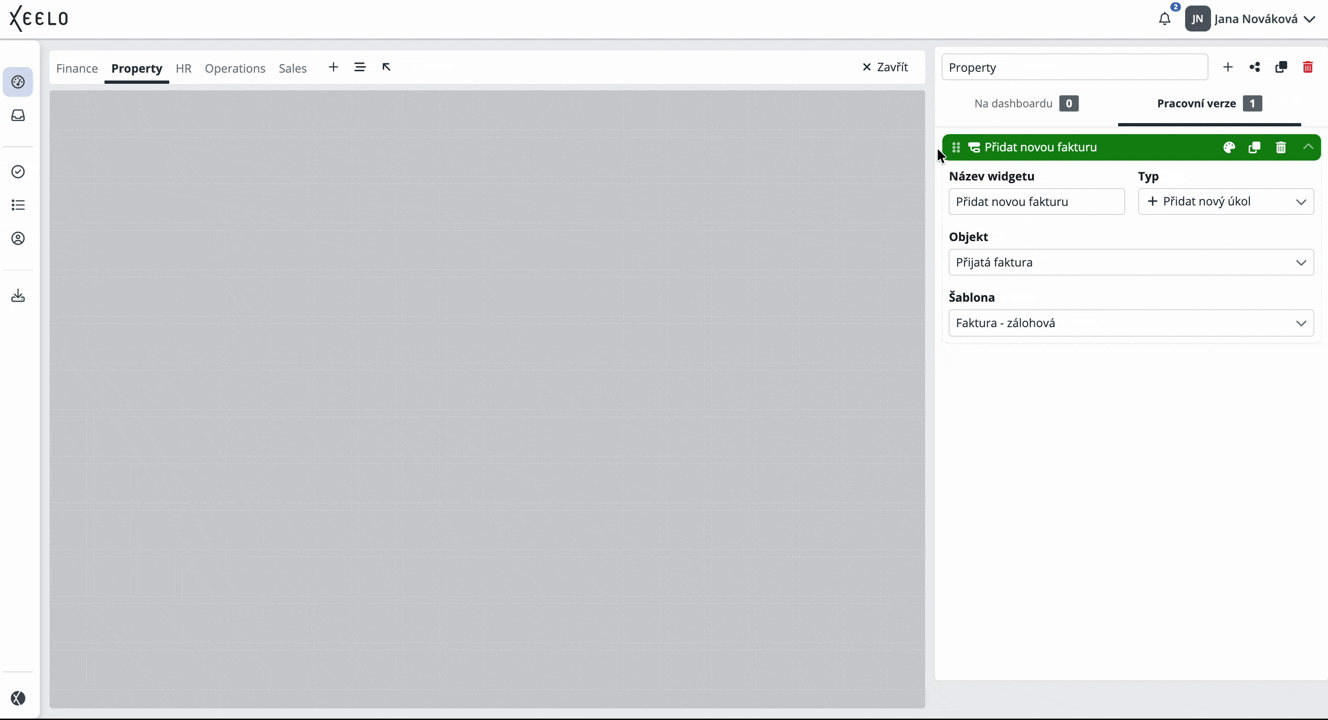 Po kliknutí na tlačítko se zobrazí nabídka dostupných widgetů. Stačí vybrat požadovaný typ a následně ho nakonfigurovat podle svých potřeb. Widget se automaticky přesune do části Pracovní verze, odkud ho můžete přidat na plochu dashboardu.