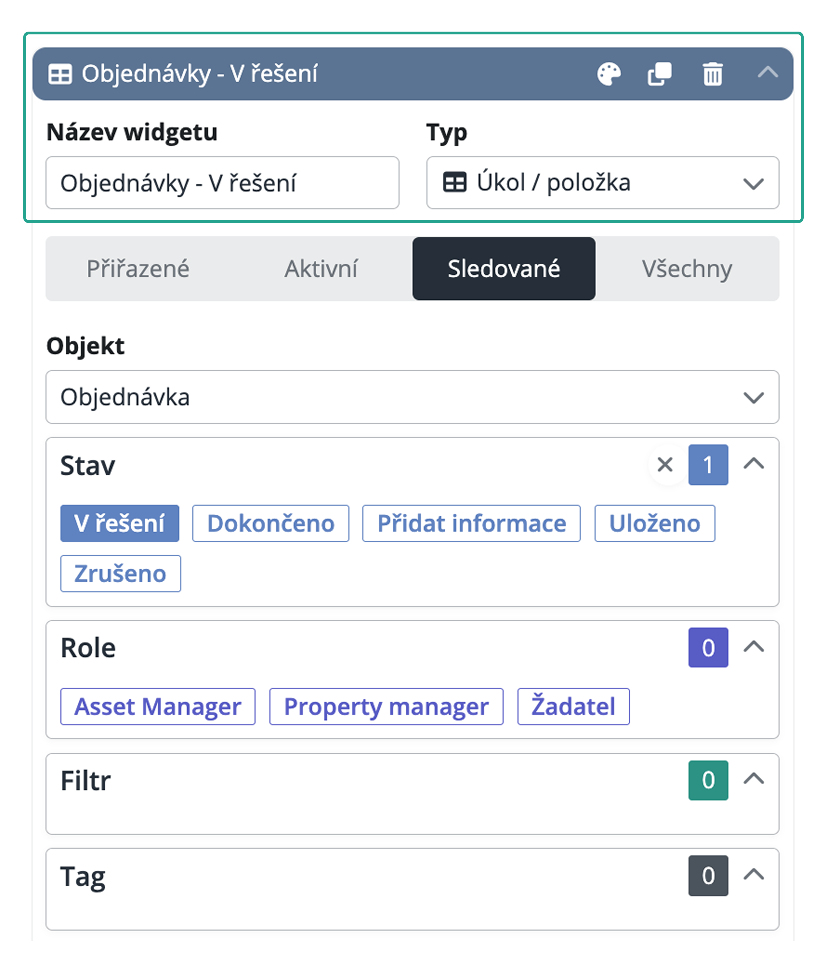 Následně si můžete filtrování dále zpřesnit podle dostupných možností (role, stav, tagy nebo vlastní uložený filtr). Výsledkem je přehled požadavků, který odpovídá přesně tomu, co potřebujete na dashboardu sledovat.