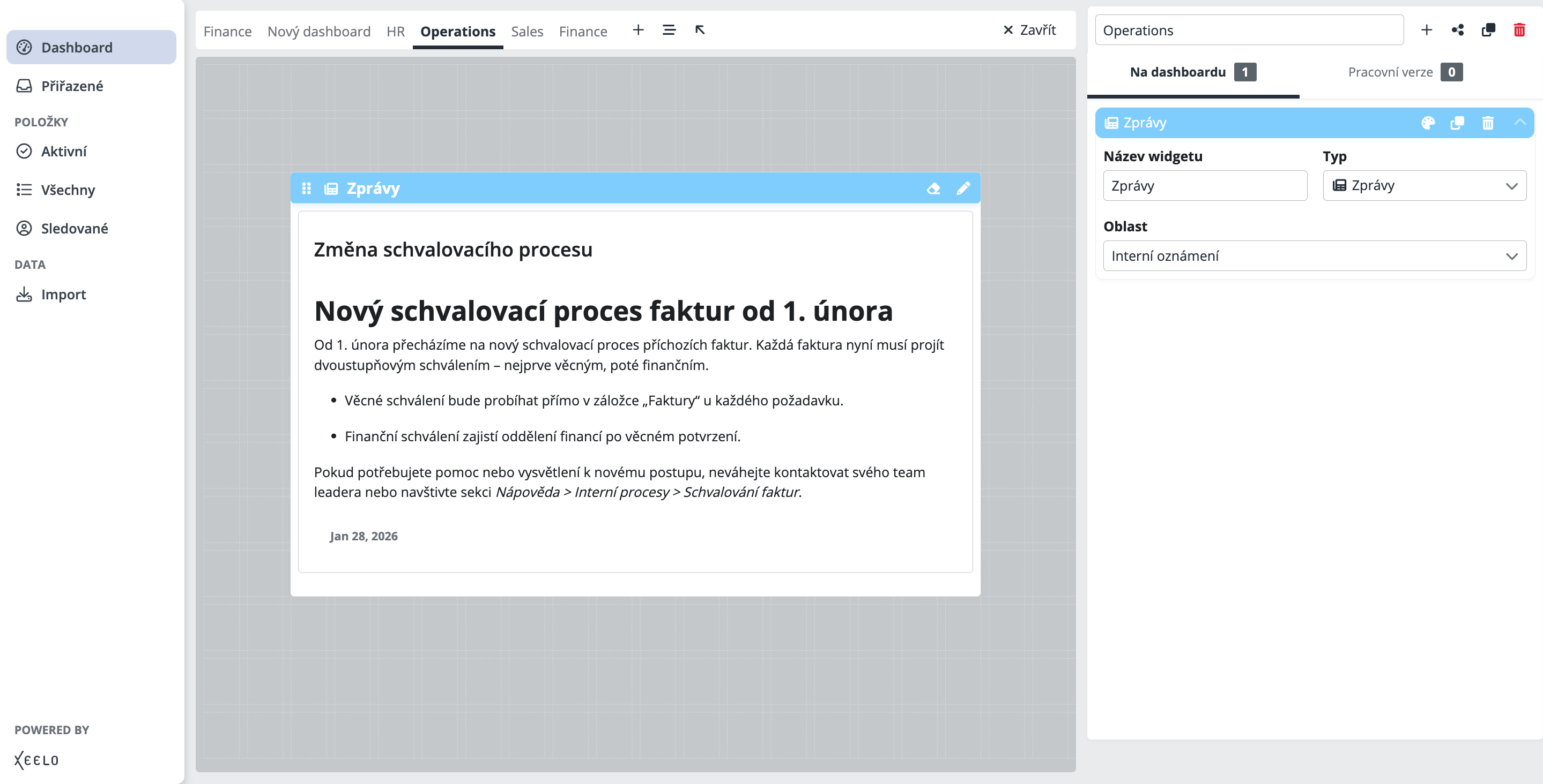 Používejte Zprávy jako centrální místo pro interní oznámení. Týmové novinky, změny nastavení nebo důležitá upozornění tak máte vždy po ruce, přímo na dashboardu.