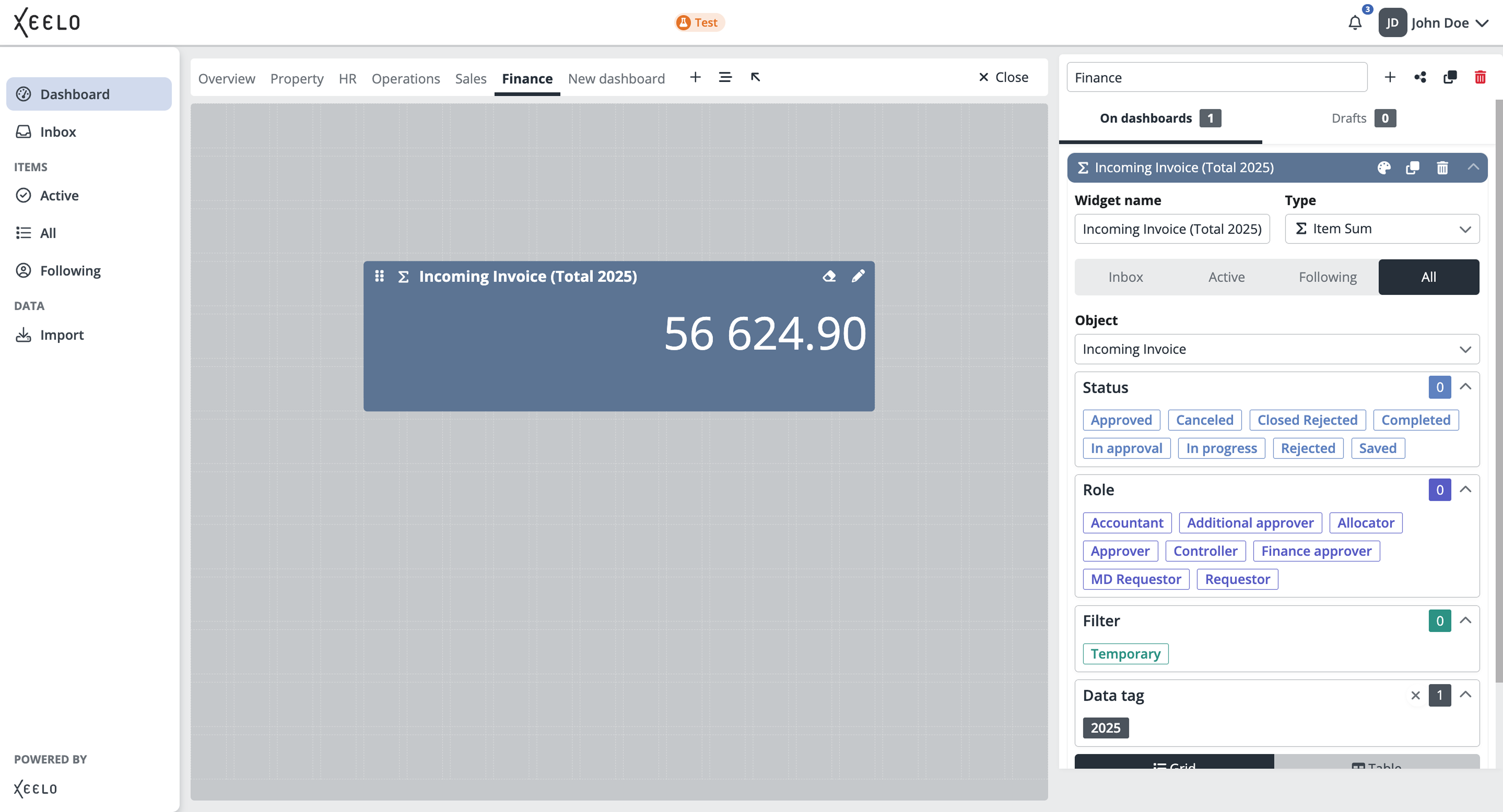 Do you want to know the total value of issued invoices for the current period? Select the total amount field, and the widget will display the sum of those invoices on the dashboard and give you an immediate overview of business performance.