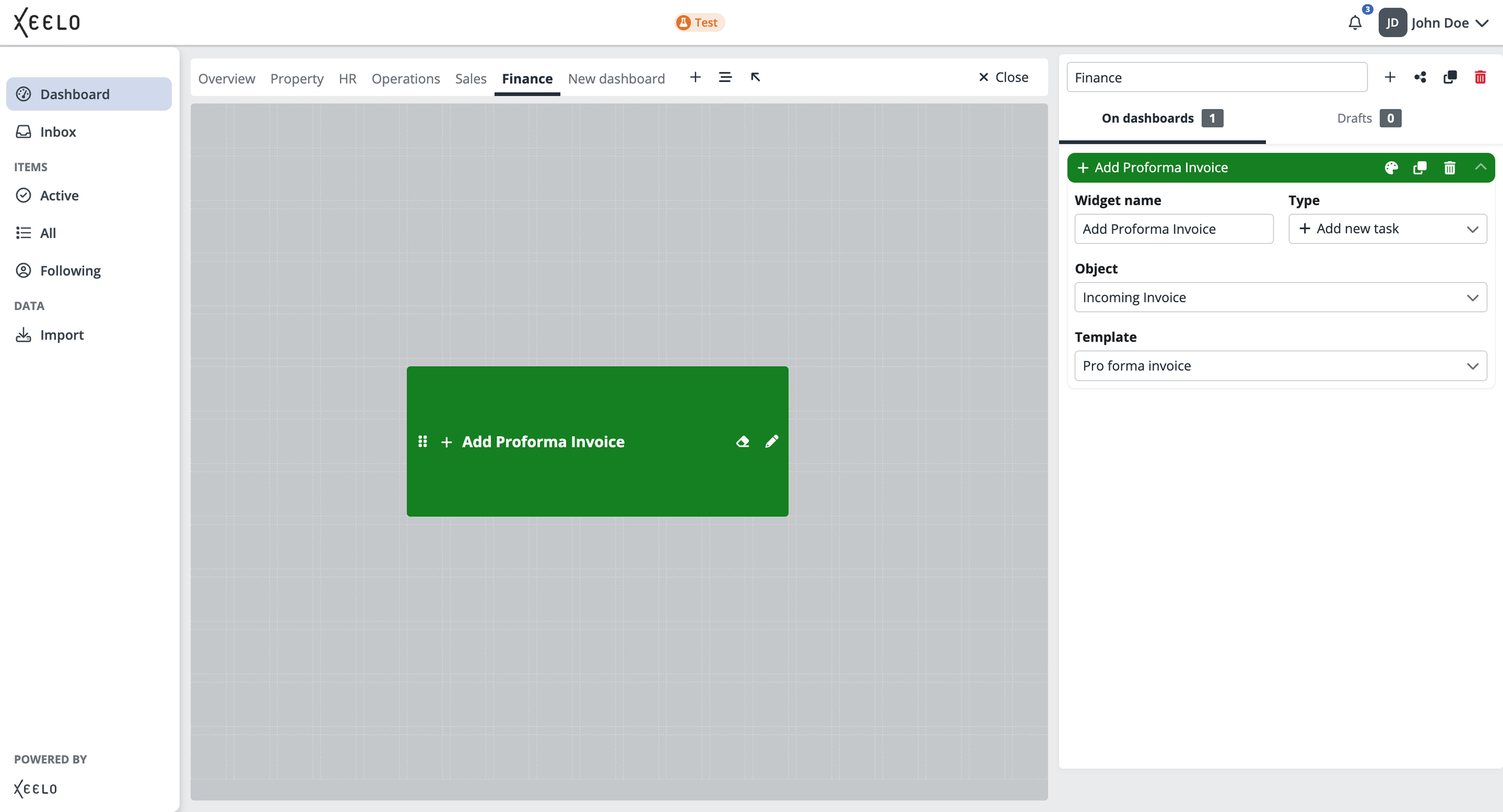 This widget serves as a quick shortcut for creating new requests. It allows you to start a new task for a specific object directly from the dashboard—for example, create a new invoice, submit a leave request, or request a business trip.