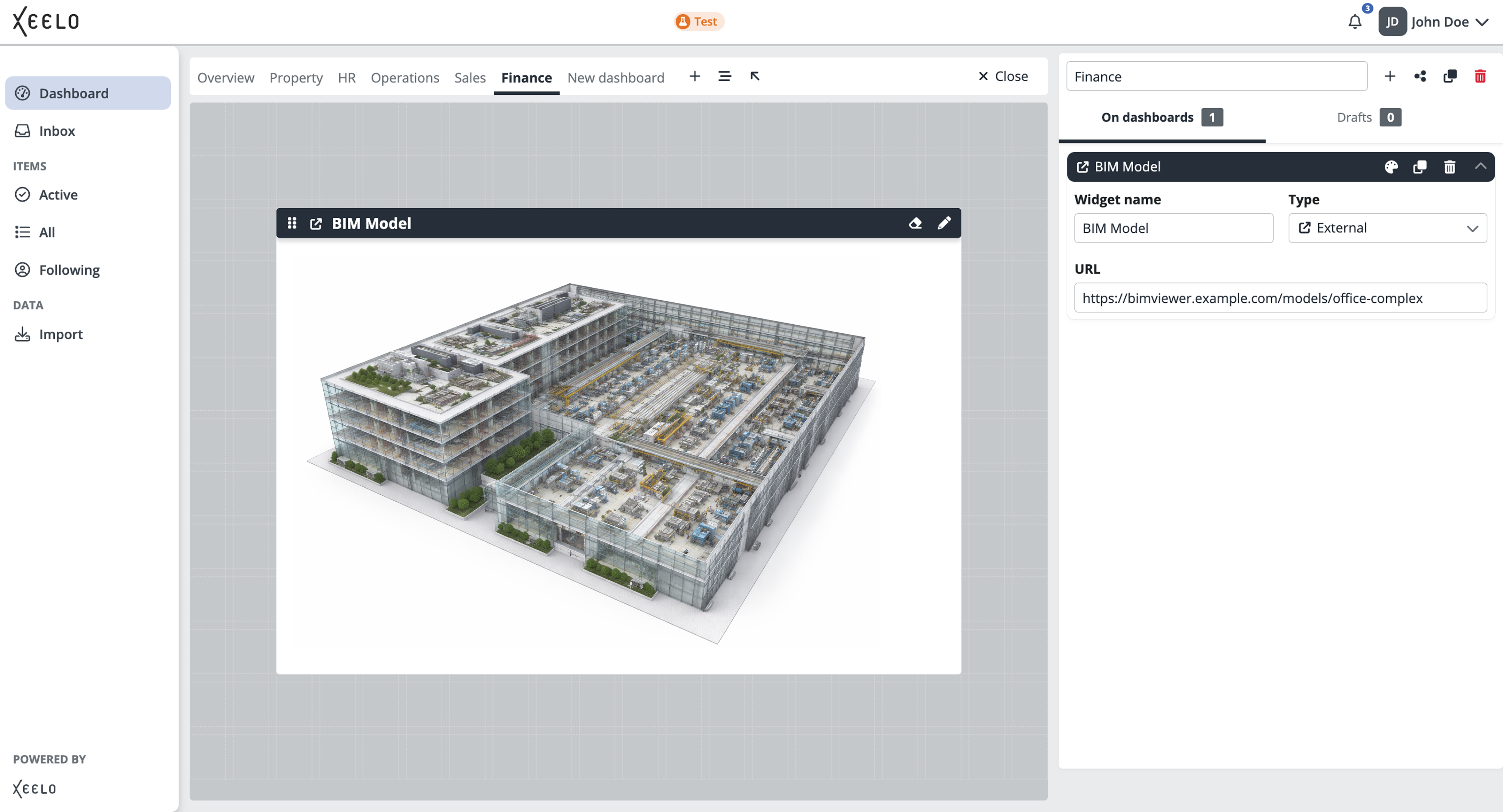Do you need quick access to an external application, portal, or visualization? Add a link to your dashboard—for example, an online BIM building model. The model is displayed directly in the widget and lets you interact with it without leaving the platform.