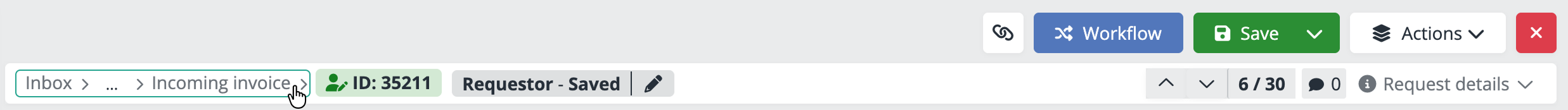 On the left side, the breadcrumb navigation shows the path to the current request. It helps you understand where the request sits within the system structure and lets you return to higher levels without manually navigating back through request lists.