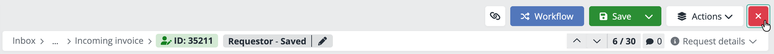 The close button exits the request detail and returns you to the previous view. If you made changes that you have not saved yet, Xeelo warns you before closing the form. This action does not change the request status or move it within the workflow. It only lets you leave the form safely.