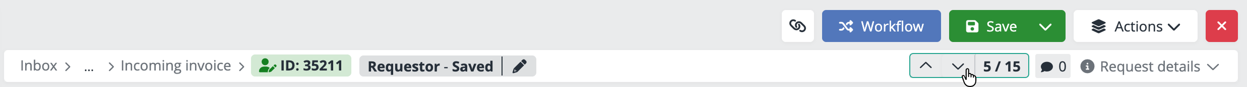 When you work with multiple requests, you often need to process them one after another. Arrow navigation at the top of the request detail lets you move smoothly between requests without returning to the request list. Next to the arrows, Xeelo shows the current position in the format current/total (e.g., 3/13). The first number indicates the position of the opened request. The second number represents the number of requests loaded on the current request list page.