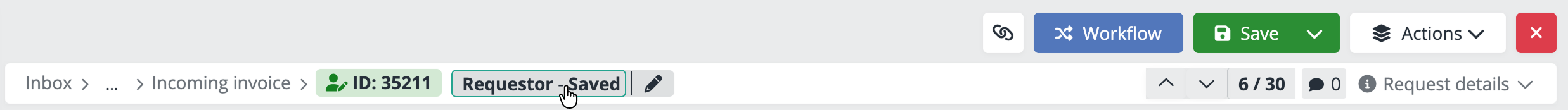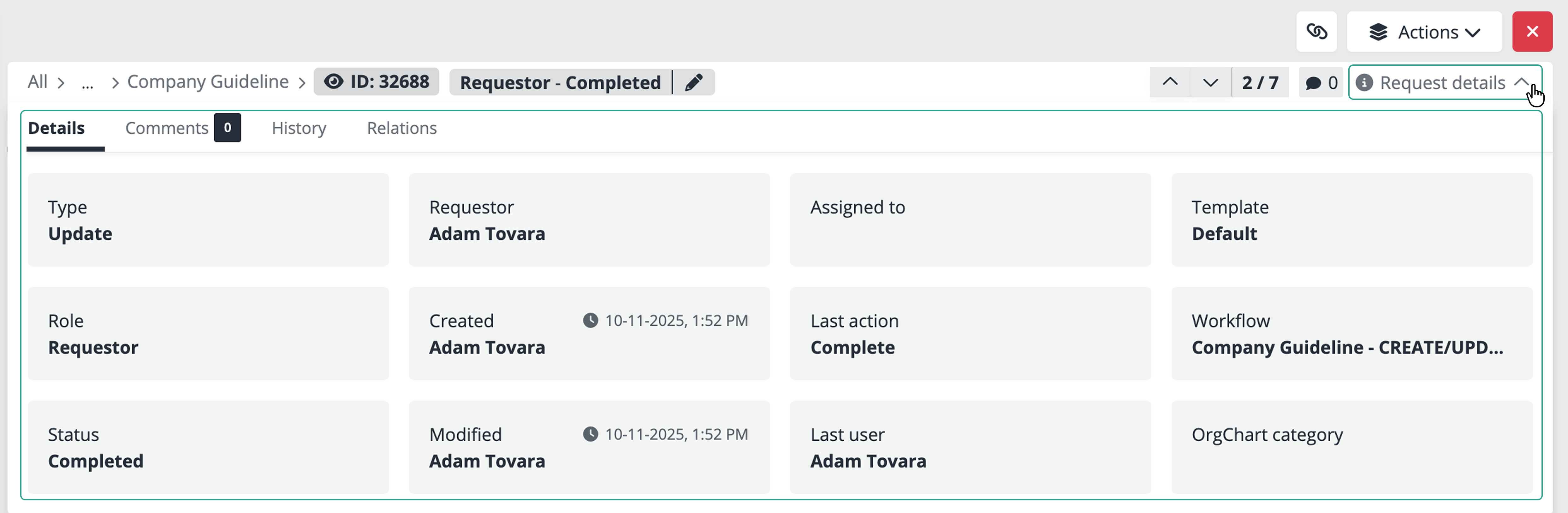 The request detail also adapts dynamically to the current workflow state and the user’s role. As the request progresses, both the form content and the available actions can change. Some fields may become required, others read-only, or they may not appear at all. This approach helps you focus only on what matters in the current step and guides you through the process without unnecessary distractions.