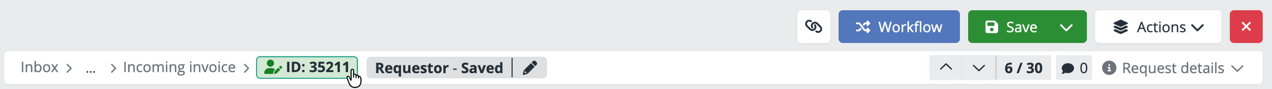Next to the breadcrumb navigation, Xeelo displays a unique request ID. You can use this ID to clearly identify the request when communicating with colleagues, referencing it in comments, or contacting support. Each update of a completed request creates a new request version with a new ID. Xeelo keeps the original ID and makes it available in the request history. This approach preserves a complete audit trail and lets you track how the request evolved.