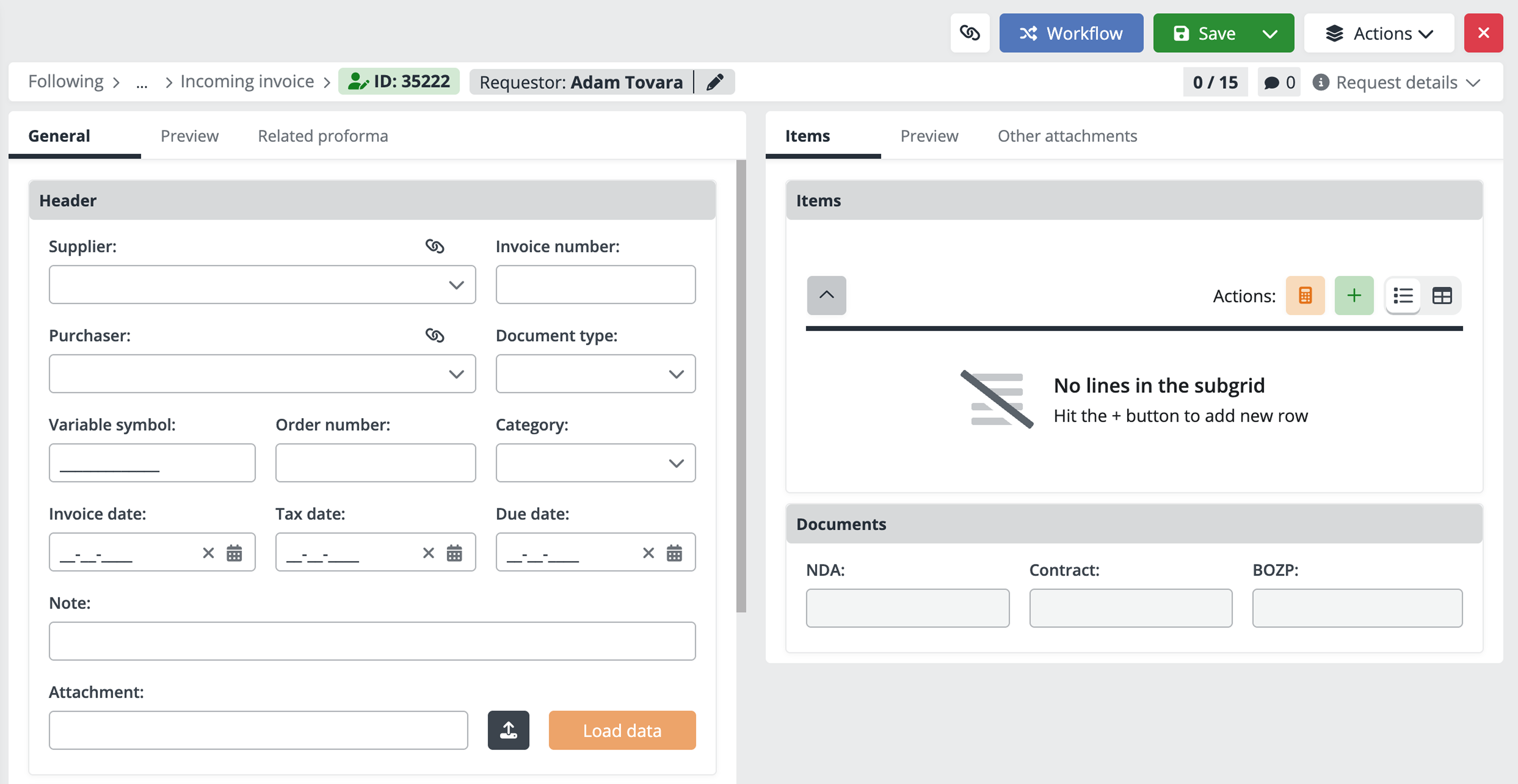 The form content always depends on the object type and the specific process the request belongs to. As a result, each request detail can look different. It includes only the fields and sections that make sense for the given area of work, such as identification data, amounts, line items, due dates, or other specific information. Rather than using a generic template, the system provides a focused workspace designed around real process requirements.