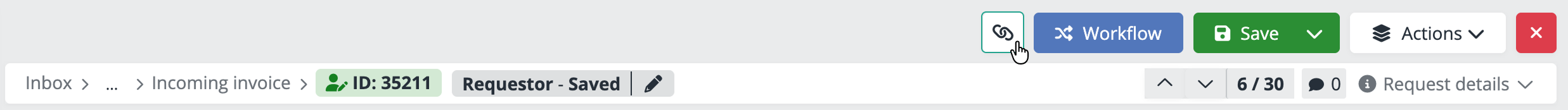 This button lets you quickly copy a direct link to the currently opened request. After clicking it, Xeelo stores the link in your clipboard so you can paste it into an email, chat, or comment. The link always points directly to the specific request and respects access permissions. Only users who have access to the request can open it. This action works especially well when you collaborate with colleagues or need to quickly share a specific record.