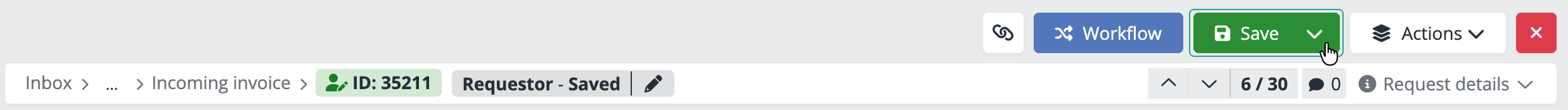 At the top of the request detail, Xeelo displays a set of actions that let you manage the request. You use these actions to save changes, move the request through the workflow, share it with others, or perform other operations related to the entire request. Xeelo determines which actions are available based on: