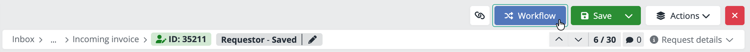 The Workflow action controls the request lifecycle. You use it to decide what happens next—for example, whether the request moves to another processing step, gets approved, returns for completion, or closes. When you click Workflow, Xeelo displays a list of available workflow actions. Xeelo automatically adjusts this list based on the current request state, your role, and the administrator-defined workflow configuration. Xeelo prevents you from selecting actions that do not apply to the current state. This behavior ensures consistent processing and helps the request follow the correct workflow path.