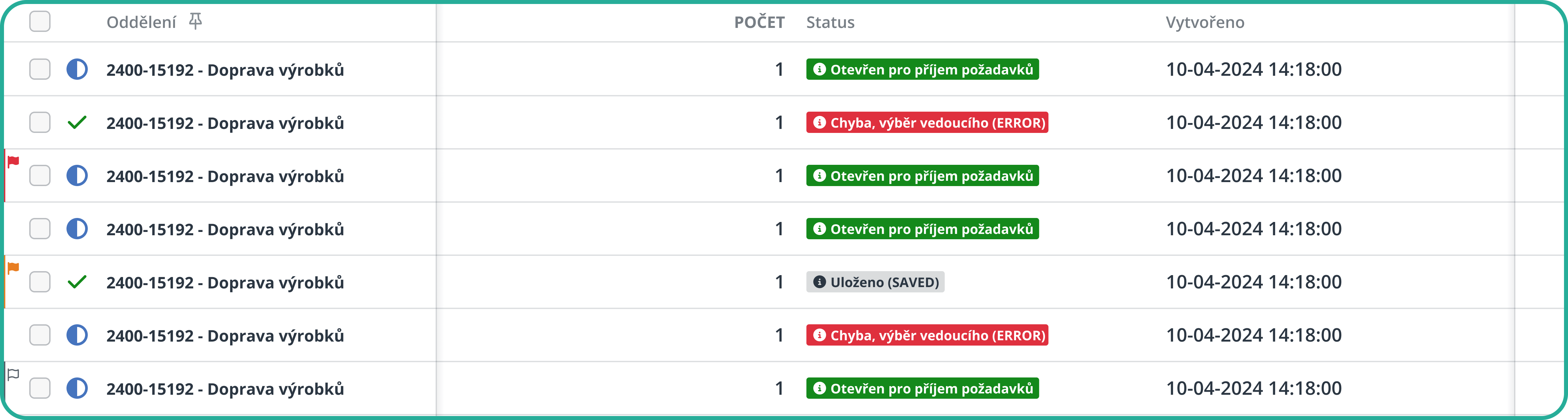 Na začátku každého řádku se nachází zaškrtávací políčko, díky kterému lze označit jeden nebo více požadavků najednou. Jakmile provedete označení, automaticky se zobrazí nástrojový panel, který nabízí hromadné akce nad vybranými položkami. Podrobný popis najdete v kapitole Panel nástrojů.