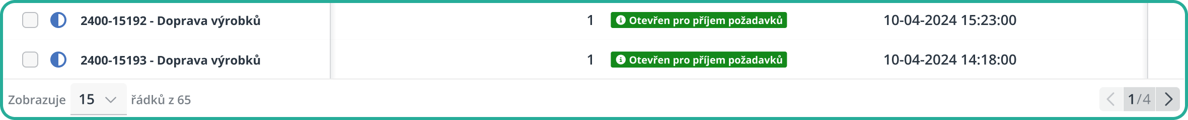 Výpis požadavků je v přehledu ve výchozím nastavení rozdělen na stránky po 15 řádcích. Pokud počet položek přesáhne tento limit, automaticky se aktivuje stránkování. Přehled se rozdělí na více stran, mezi kterými lze přecházet pomocí šipek ve spodní části. Vedle výběru počtu záznamů na stránku se zobrazuje i informace o celkovém počtu dostupných záznamů. Například, že je zobrazeno 15 záznamů (na jednu stránku) a celkem se v přehledu nachází 65 záznamů.