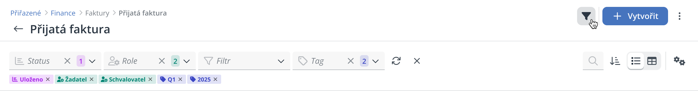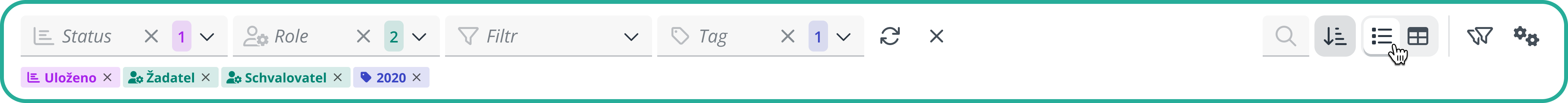 V pravém horním rohu panelu najdete ikonu ozubených koleček, která slouží k úpravě zobrazení jednotlivých filtrů. Kliknutím na tuto ikonu otevřete nabídku, ve které si můžete přizpůsobit, které možnosti filtrování chcete mít zobrazené (Role, Status, Vlastní filtr nebo Tagy).