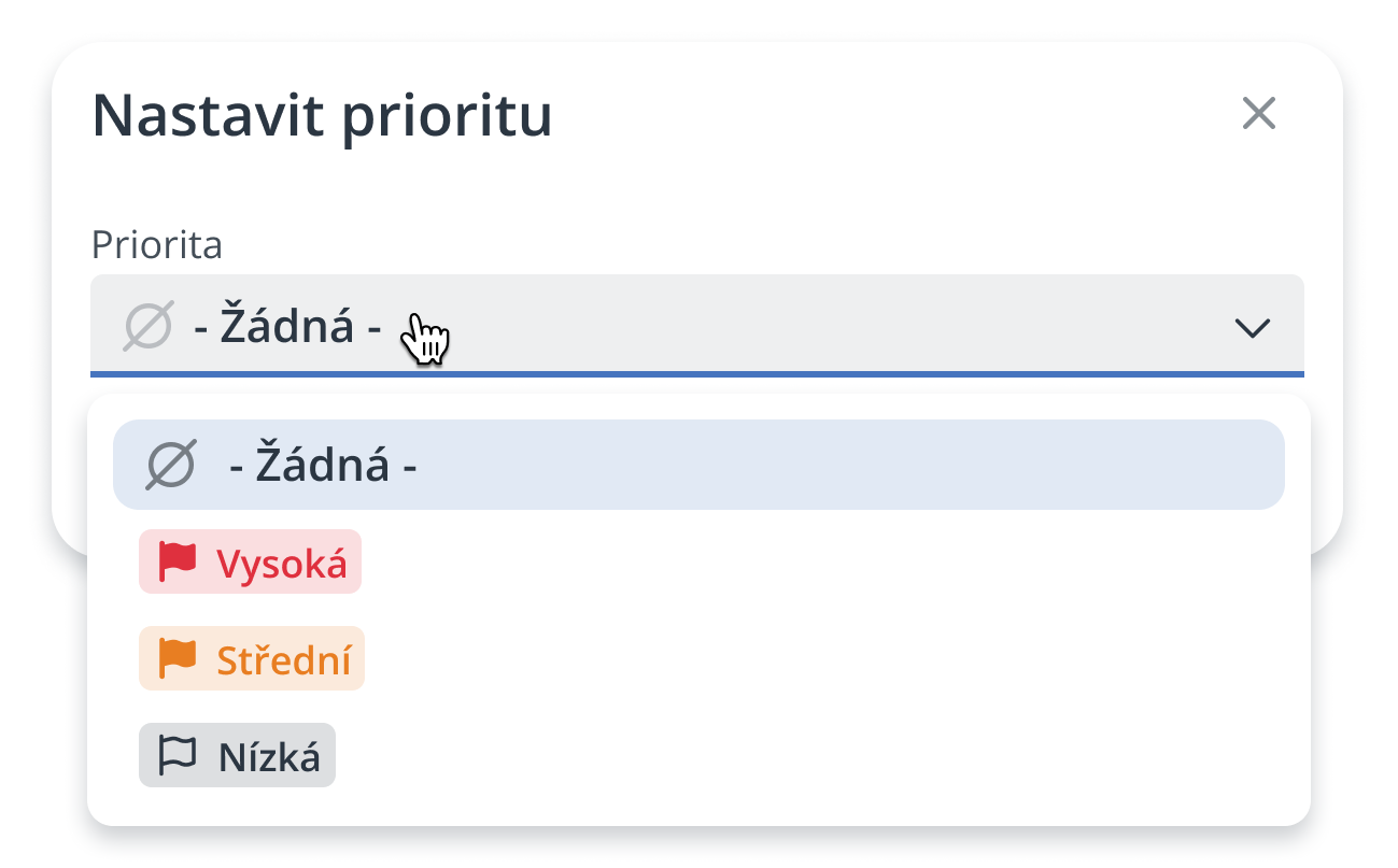 Tato akce umožňuje přiřadit vybranému požadavku jednu ze čtyř úrovní priority: Žádná, Nízká, Střední nebo Vysoká. Při změně z výchozí hodnoty (Žádná) se na levé straně řádku automaticky zobrazí barevný indikátor – šedá vlajka pro nízkou, oranžová pro střední a červená pro vysokou prioritu. Barevné označení zvyšuje přehlednost, pomáhá s vizuálním tříděním a podporuje efektivní týmovou spolupráci.