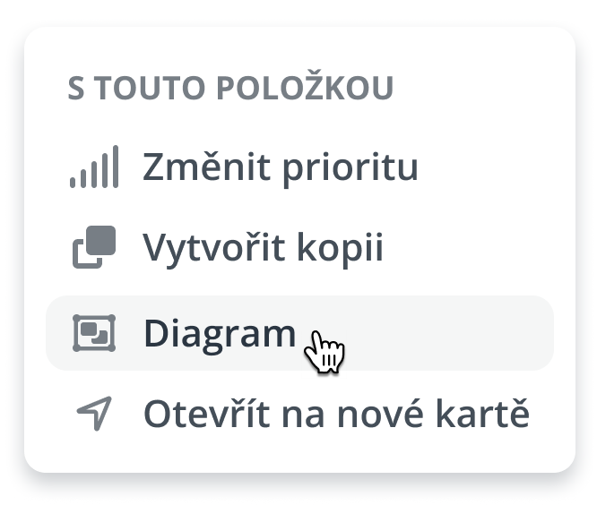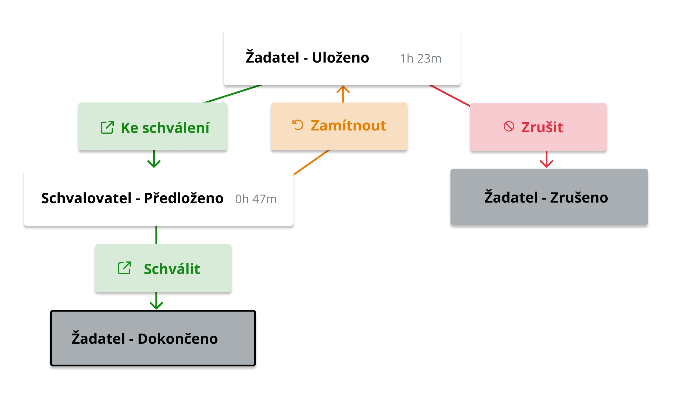 Akce Diagram otevře vizuální znázornění životního cyklu požadavku v podobě schématu workflow – od jeho založení až po finální dokončení. V zobrazeném schématu uvidíte všechny kroky a akce workflow, jejich pořadí, aktuální stav i historii zpracování. Každý krok obsahuje také údaj o tom, jak dlouho se požadavek v daném stavu nacházel. Získáte tak okamžitý přehled o tom, kde se požadavek právě nachází, kdo s ním pracoval, a kde mohlo dojít ke zdržení.
