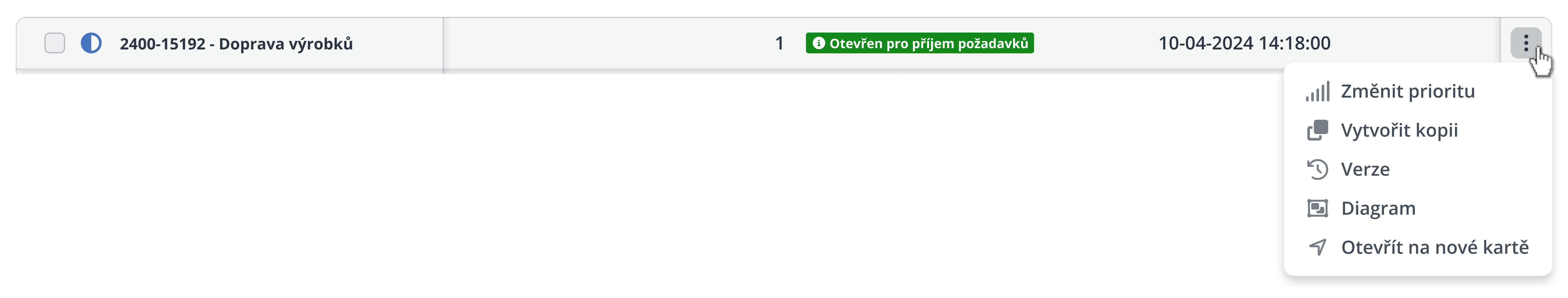 Každý řádek představuje jeden konkrétní požadavek nebo úkol, který si na základě uživatelských práv máte možnost zobrazit, sledovat jeho postup nebo jej dále zpracovávat. Na pravé straně každého řádku je umístěno tlačítko se symbolem tří teček, které slouží pro rychlý přístup k akcím vztahujícím se výhradně k danému požadavku.