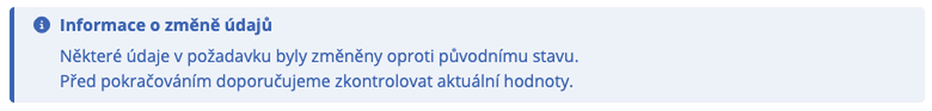 - Informační zpráva - Poskytuje doplňující informaci k dané akci nebo stavu požadavku. Neomezuje pokračování ve workflow.