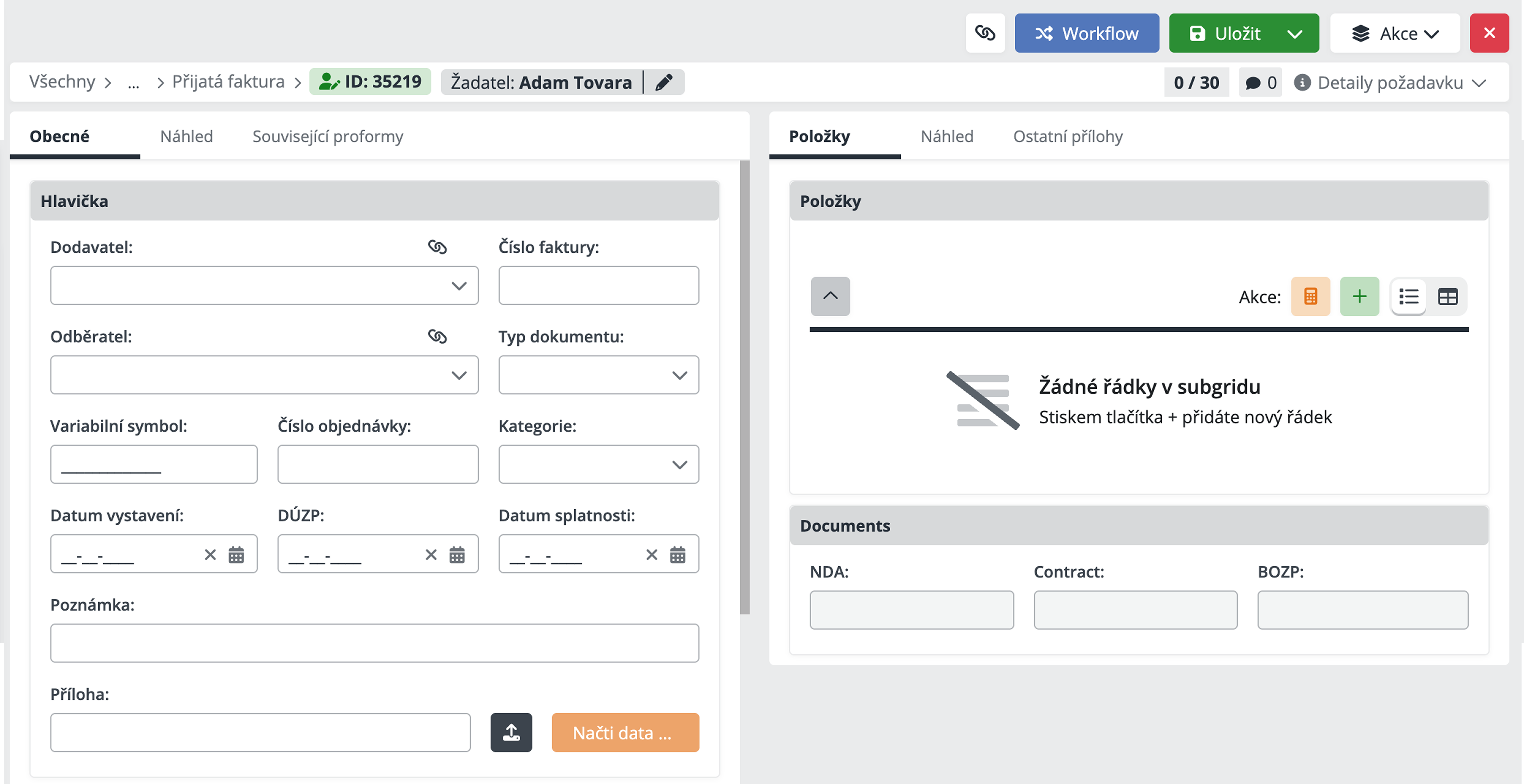 Obsah formuláře se vždy odvíjí od typu objektu a konkrétního procesu, ke kterému požadavek patří. Každý detail proto může vypadat jinak – obsahuje pouze ta pole a sekce, které dávají smysl pro danou oblast práce, například identifikační údaje, částky, položky, termíny nebo další specifické informace. Nejde o univerzální šablonu, ale o cílený pracovní prostor navržený podle reálných potřeb daného scénáře.