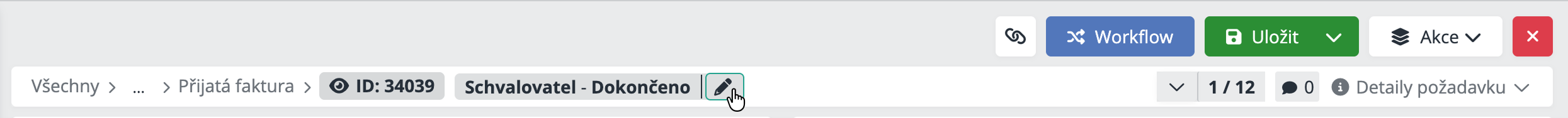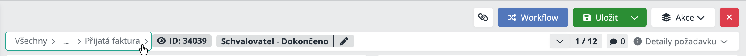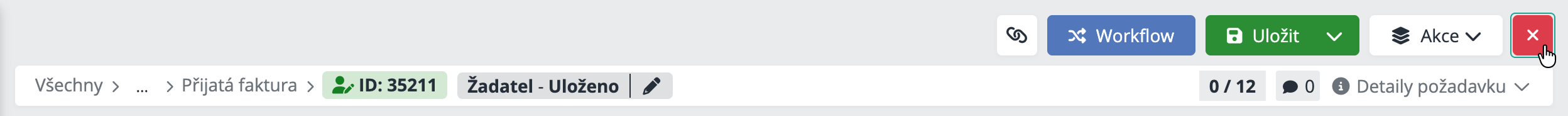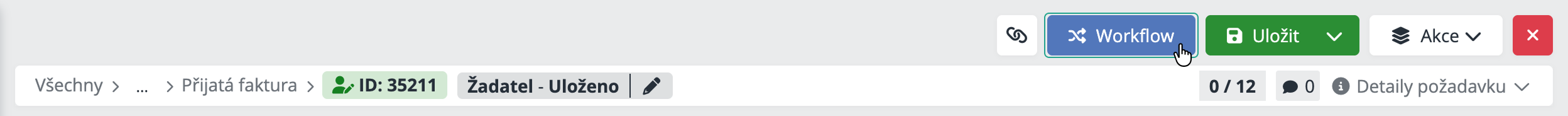 Workflow - Otevře nabídku workflow akcí dostupných pro aktuální stav požadavku. Umožňuje posunout požadavek do další fáze procesu, vrátit ho k doplnění, schválit nebo uzavřít.