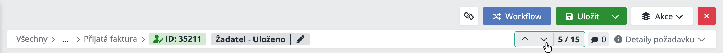 Při práci s více požadavky často potřebujete postupně projít jeden za druhým – například je zkontrolovat, doplnit nebo schválit. Proto je v horní části detailu k dispozici navigace pomocí šipek, která vám umožní plynule přecházet mezi jednotlivými požadavky. Vedle šipek se zobrazuje také pořadí aktuálního požadavku ve formátu aktuální / celkem (například 3 / 13). První číslo označuje pozici právě otevřeného požadavku, druhé číslo odpovídá počtu požadavků, které jsou aktuálně načteny na jedné stránce v přehledu.